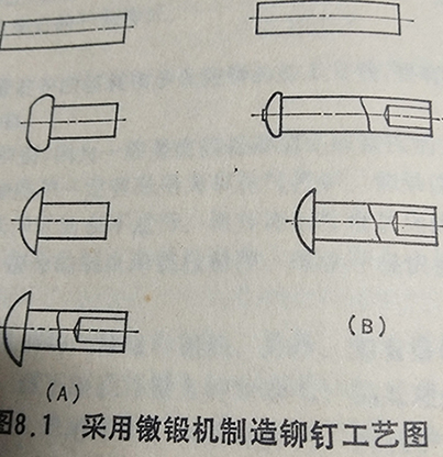 第一種方法是采用實心鉚釘成型同樣的鐓鍛機加工成實心體的鉚釘,然后在桿端用專用的鉆床二次加工圓柱孔