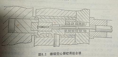 成型后的空心鉚釘被頂?shù)疥幠G懊?,被空心成型銷擠出空心孔的鉚釘用稱為脫模器的工具將銷。